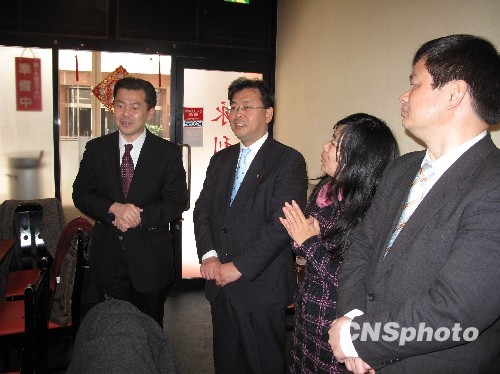 2月14日下午,日本湖南人会主办的虎年春节团拜会在东京池袋举行。与会的日本参议院议员西田实仁用中文向大家拜年,还介绍了他留学中国的经历和推进日中友好的主张,受到中日朋友的好评。图为西田实仁(左2)用中文发言。中新社发 段跃中 摄