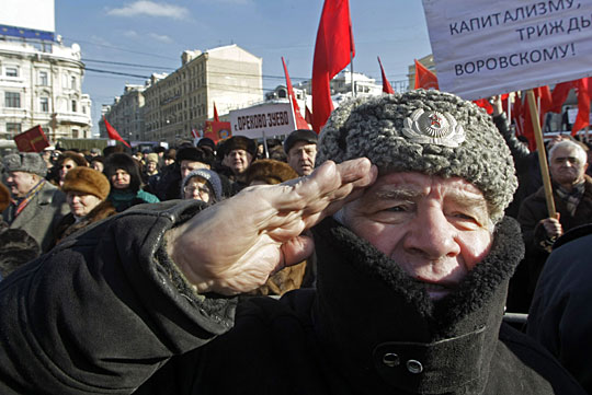 2月23日,俄罗斯莫斯科,示威者参加俄罗斯共产党组织的集会,抗议军队改革。