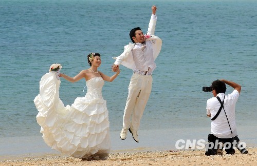 当地时间2月28日,一对新人正在美国夏威夷檀香山的海滩上拍婚纱照。昨天,夏威夷经历了一场海啸惊魂,所幸只是虚惊一场,海啸警报解除后,夏威夷的海滩恢复如常。中新社发 张炜 摄
