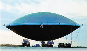 飞碟数据:载重量 600吨;时速 100公里;耗资 900亿美元;优点 垂直起降,对地面要求很低