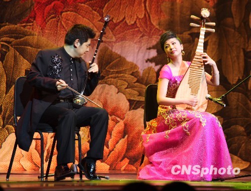 当地时间3月7日晚,“文化中国·四海同春”北美代表团在多伦多第7次为北美观众送上中华文化盛宴,再次收获无数欢声笑语和掌声,激荡北美的中华文化之旅划上了完美的句号。图为陈军与夫人刘珂夫唱妇随,展示了二胡与琵琶的珠联璧合。中新社发 赖海隆 摄