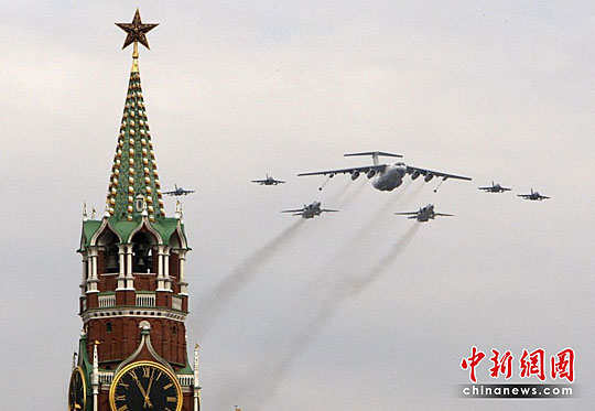 当地时间5月4日,在俄罗斯首都莫斯科,参加彩排的战机编队飞过红场上空。俄罗斯将于5月9日隆重纪念卫国战争胜利65周年。