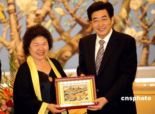 5月21日,北京市长郭金龙在北京饭店会见台湾高雄市市长陈菊时,陈菊向郭金龙赠送描绘高雄港景观的工艺品。中新社发 廖攀 摄