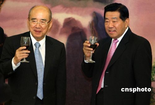 5月25日晚,中共中央政治局常委、全国政协主席贾庆林在北京人民大会堂宴请中国国民党主席吴伯雄与他率领的参访团一行。中新社发 任晨鸣 摄