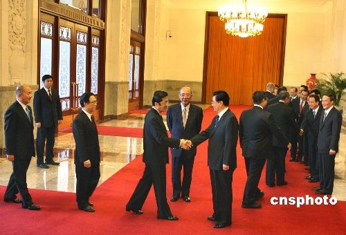 5月26日下午,中共中央总书记胡锦涛在北京人民大会堂会见中国国民党主席吴伯雄与他率领的参访团。中新社发 任晨鸣 摄