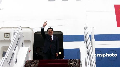 中国国家主席胡锦涛十四日傍晚乘专机抵达俄罗斯叶卡捷琳堡,出席上海合作组织成员国元首理事会第九次会议、“金砖四国”领导人会晤。 中新社发 齐彬 摄