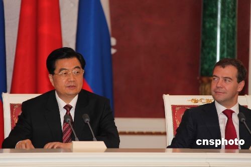 当地时间六月十七日,莫斯科克里姆林宫,正在俄罗斯进行国事访问的中国国家主席胡锦涛,与俄罗斯总统梅德韦杰夫共同会见记者。中新社发 齐彬 摄
