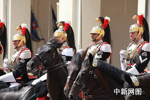 正在意大利进行国事访问的中国国家主席胡锦涛当地时间六日上午来到位于罗马的总统府,与意大利总统纳波利塔诺举行会谈。图为列队欢迎胡锦涛的意大利骑兵仪仗队。中新社记者 张朔摄