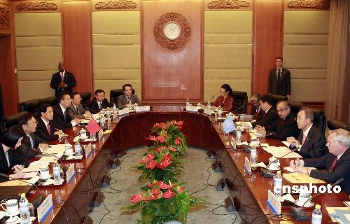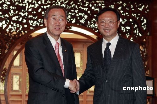 7月24日,北京钓鱼台国宾馆,中国外交部部长杨洁篪与联合国秘书长潘基文举行会谈。中新社发 盛佳鹏 摄