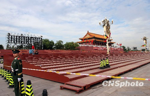 近日,为迎接建国60周年大庆,在北京天安门广场为庆典增设的临时观礼台、大型LED屏幕等设施,目前正在有条不紊的布置中。中新社发 陈晓根 摄