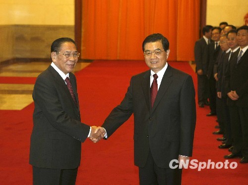9月9日,中共中央总书记、中国国家主席胡锦涛在北京人民大会堂与老挝人民革命党中央总书记、国家主席朱马里·赛雅颂举行会谈。中新社发 盛佳鹏 摄