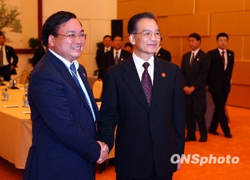 9月10日,中国总理温家宝在大连会见了出席世界经济论坛第三届领军者年会(夏季达沃斯)的越南副总理黄忠海。中新社发 杜洋 摄