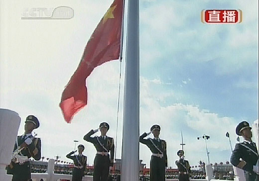 2009年10月1日,中华人民共和国成立60周年庆祝大会在北京天安门广场举行。图为升旗仪式。(电视截图)