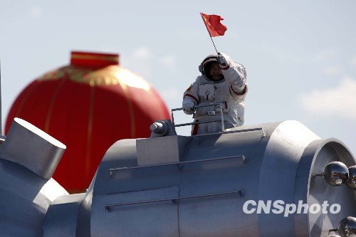 10月1日,中华人民共和国成立60周年庆祝大会在北京举行,航天员翟志刚等航天人在群众游行队伍中亮相。 中新社发 盛佳鹏 摄