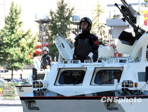 10月1日上午,中华人民共和国成立60周年庆祝大会在北京举行。图为武警“雪豹突击队”装甲车通过长安街。中新社发 侯宇 摄