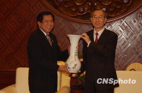 10月18日,菲律宾众议长诺格拉雷斯(左)率团抵达广西南宁,出席将于10月20日开幕的第六届中国—东盟博览会、中国—东盟商务与投资峰会。当晚,广西壮族自治区主席马飚拜会诺格拉雷斯一行。中新社发 刘万强 摄