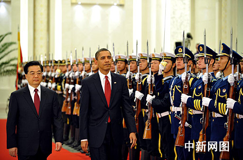 中国国家主席胡锦涛17日上午约9点50分在人民大会堂北大厅举行仪式,欢迎美国第44任总统奥巴马对中国进行国事访问。中新社记者 廖攀 摄