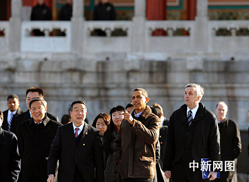 美国总统奥巴马11月17日下午乘车前往北京故宫博物院进行参观。北京故宫博物院负责人在金水桥南侧进行迎接。随后奥巴马由太和门进入太和殿前广场,沿着故宫中轴路,依次参观中和殿、保和殿、乾清门、乾清宫、交泰殿、坤宁宫,再经过御花园进入漱芳斋,在这里他将接受故宫博物院准备的神秘礼物,再由顺贞门离开。中新社记者 廖攀 摄