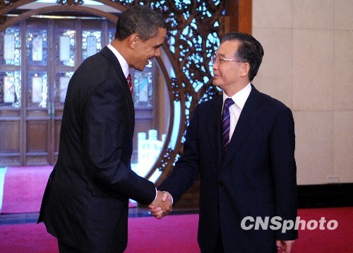 11月18日上午,中国国务院总理温家宝在北京钓鱼台国宾馆会见了美国总统奥巴马一行。中新社发 廖攀 摄