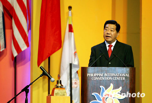 十一月二十日,全国政协主席贾庆林在菲律宾马尼拉出席“第十届世界华商大会”开幕式,并发表讲演。两年一次的世界华商大会是最高层次的全球华商盛会。此届大会以“加强华商联系,促进世界繁荣”为主题。中新社发 洪少葵 摄