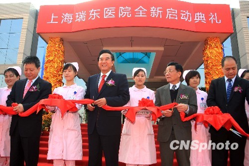 11月26日,海协会会长陈云林、上海市副市长沈晓明(左)等为沪台首家合资医院——瑞东医院全新开诊剪彩。目前常住上海的台湾居民超过20万,该合资医院开诊,不仅可以更好地服务在沪台商和家属,也是促进两岸医疗机构合作的重要举措。中新社发 潘索菲 摄