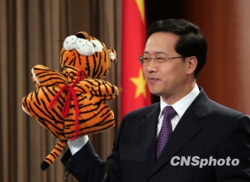 2月11日,中国外交部发言人马朝旭在例行记者会后,代表同事向与会的中外记者拜年,并送每位记者一只玩具老虎。马朝旭风趣地表示,希望大家在虎年慎重提问,否则“它”不答应。中新社发 张宇 摄
