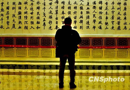 一位记者3月初在北京人民大会堂采访十一届全国人大三次会议时,对金色大厅里书写的《神州颂》产生兴趣。中新社发 贾国荣 摄