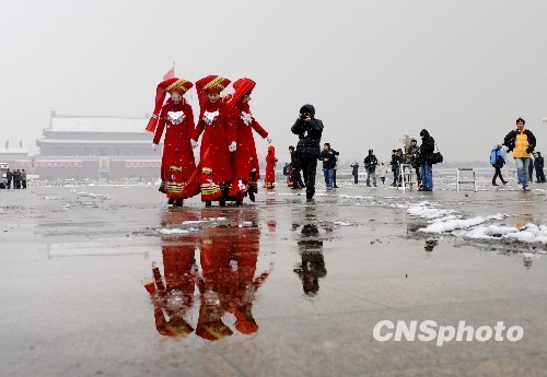 3月8日妇女节,初春的北京下起中雪,全国人大举行全体会议,穿着民族服装的两会女服务员冒着风雪在天安门广场等候代表和委员,此景形成靓丽风景线吸引众多媒体记者。中新社发 廖攀 摄