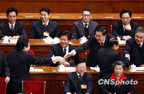 3月8日,十一届全国人大三次会议在人民大会堂举行第二次全体会议。会前代表相互问候。中新社发 杜洋 摄