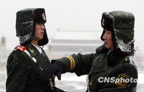 3月8日上午,一场大雪降临北京,在天安门广场为全国“两会”值勤的国旗护卫队雪中站哨,图为战友相互掸去身上的积雪。中新社发 张宇 摄