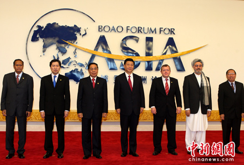 4月10日上午,博鳌亚洲论坛2010年年会在海南博鳌开幕,中国国家副主席习近平会前与参加会议的六位外国政要合影。