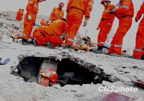 4月下旬,中国国家救援队连日在青海玉树地震灾区四处搜寻,运用专业技术打开废墟通道,便于寻找罹难人员和抢救民众的生活财产。中新社发 贾国荣 摄