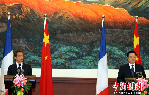 4月28日晚,中国国家主席胡锦涛在北京人民大会堂与应邀访华的法国总统萨科奇会谈后共同会见记者。中新社发 任晨鸣 摄