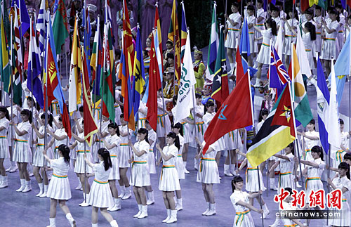 4月30日晚,上海世博会开幕式在世博文化中心举行。图为参展方旗帜方队入场。中新社发 汤彦俊 摄