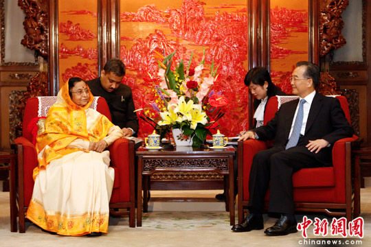 5月27日,中国国务院总理温家宝在北京中南海紫光阁会见了印度总统帕蒂尔。中新社发 盛佳鹏 摄
