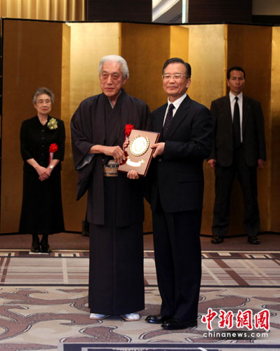 5月30日晚,中国总理温家宝在东京向日本民间友好团体和友好人士代表颁奖,感谢他们为中日关系做出的贡献。图为温家宝向日本最大的茶道组织——茶道里千家大宗匠千玄室颁奖。 中新社记者 周兆军 摄
