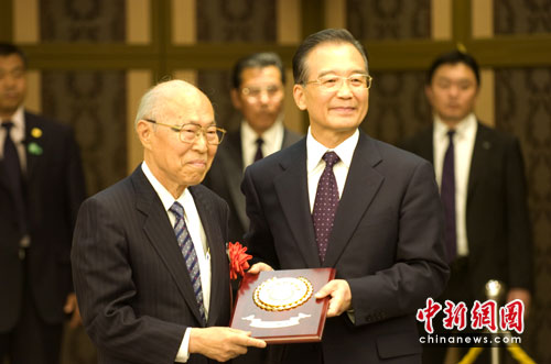 5月30日晚,温家宝总理在他下榻的东京新大谷酒店会见日本民间友好团体和友好人士代表并颁奖。图为温家宝总理向日本科学技术振兴财团会长有马朗人(左)颁奖。有马朗人为日本核物理研究领域学术权威,长期致力于对华科技交流与合作。中新社发 孙冉 摄