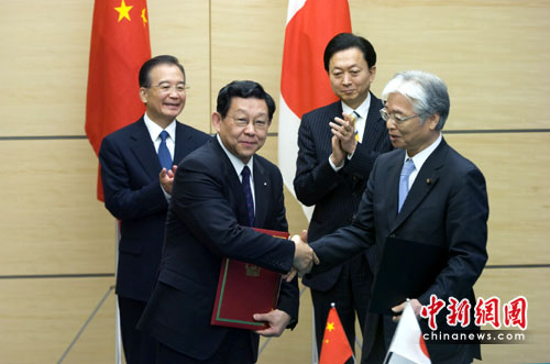 5月31日,中国总理温家宝在东京首相官邸与日本首相鸠山由纪夫举行会谈。会谈后,温家宝与鸠山由纪夫共同出席两国有关合作文件的签字仪式。双方签订了有关推进日中食品安全倡议备忘录、有关节能环保综合论坛深化的备忘录和继续开展节能人才培训的备忘录等。中新社发 孙冉 摄