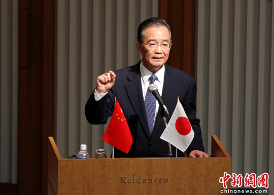 5月31日,正在日本访问的中国总理温家宝出席日本经济团体举行的欢迎午餐会并致辞。中新社发 周兆军 摄