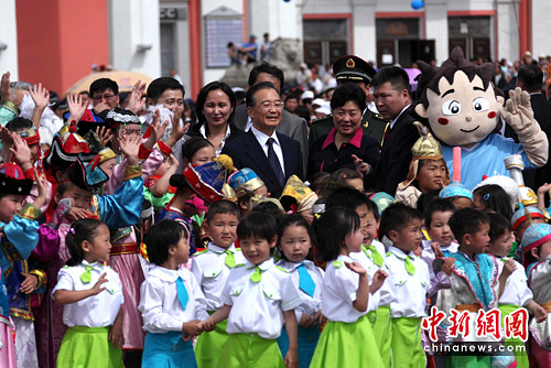 6月1日,中国总理温家宝抵达蒙古国进行正式访问,受到当地小朋友的热烈欢迎。当天恰逢“六一”儿童节,温家宝向蒙古国小朋友表示节日的祝贺。中新社发 周兆军 摄