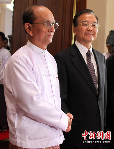 6月3日,中国总理温家宝在内比都与缅甸总理登盛举行会谈。中新社记者 周兆军 摄