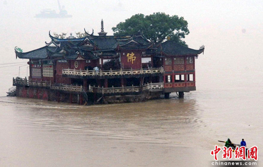 6月15日,受连日暴雨影响,位于福州闽江洪塘大桥附近江心洲上的金山寺周围闽江水位上涨。据气象部门预测,端午节期间福建将出现强降水过程,此次降水过程强度强、持续时间长、范围广。中新社发 刘可耕 摄
