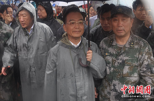国务院总理温家宝6月24日到达江西抚州,察看汛情、灾情,看望受灾群众,慰问奋战在抗洪抢险一线的解放军、武警、公安消防官兵,指导抗洪救灾工作。刘德生 摄