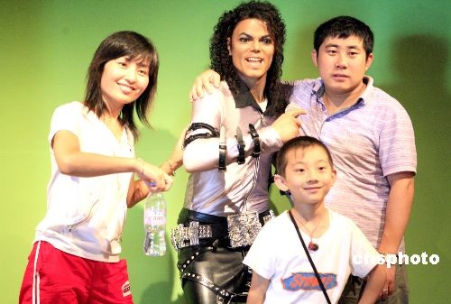 七月二十一日,游客在香港杜莎夫人蜡像馆与杰克逊的蜡像合影留念以怀念这位逝去的世界级歌王。中新社发 张勤 摄