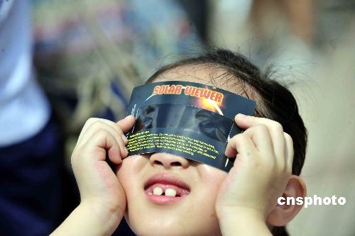 二十二日,香港几百名市民到尖沙咀太空馆观看日偏食,而太空馆提供滤光镜予市民观看日偏食。中新社发 谭达明 摄