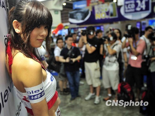 八月二十一日,香港一连四日的电脑通讯节,在湾仔会展揭幕。有参展商以女模推介产品,吸引大批市民拍照。中新社发 谭达明 摄
