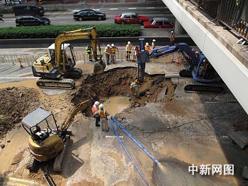 作为香港岛主干道之一的告士打道,八月三十一日发生咸水管爆裂事故,导致路面塌陷,需要断路维修。港岛一度出现罕见大塞车。水务署调集多部挖掘机等工程车辆,将水管爆裂点挖开一个约五米见方、约两米深的大坑,并用水泵向往排水。目前工程维修人员正全力抢修。记者 余瑞冬 摄
