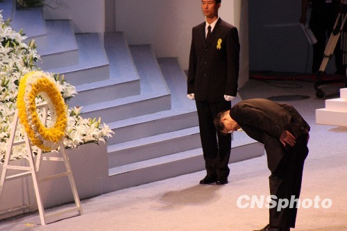 9月7日,“88水灾”追悼大会在高雄市巨蛋举行,因为动了手术久未公开露面的萧万长也出席,并向罹难者灵位敬献了鲜花。中新社发 董会峰 摄