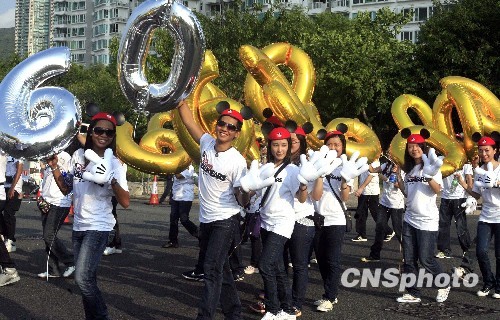 九月二十日,香港举办“欢庆中华人民共和国成立六十周年-海陆巡游大汇演”大型庆祝活动。图为陆地巡游迪士尼义工表演队伍。中新社发 张勤 摄