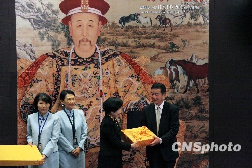 10月6日,北京故宫博物院院长郑欣淼向台北故宫博物院致赠《清乾隆朝清文大藏经》,台北故宫院长周功鑫回赠《清康熙朝藏文龙藏经》。两岸故宫60年来首度合办的展览“雍正——清世宗文物大展”,7日将在台北故宫博物院开展,这是两岸故宫开启“务实交流”后,交出的首张亮眼的成绩单。中新社发 黄少华 摄